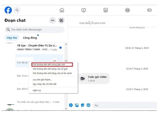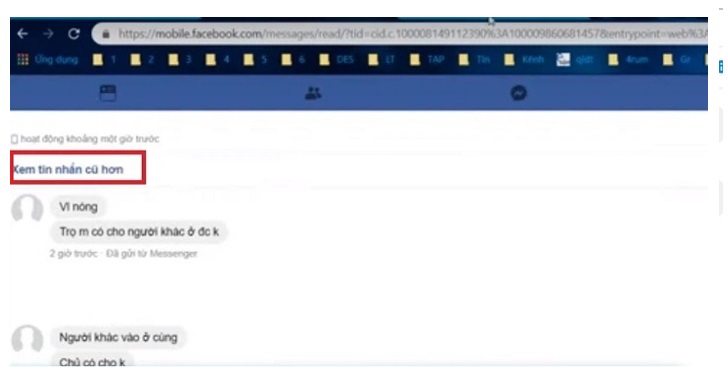 Bước 3: Ở giao diện mới hiển thị, bạn tiến hành lần lượt việc chọn Xem tin nhắn cũ hơn. Bạn click chọn Mở đường liên kết trong tab mới.