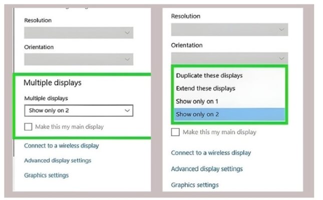 • Bước 2: Hệ thống sẽ tự động thực hiện nhận diện được ra màn hình thứ hai. Bạn kéo xuống mục Multiple displays thì bạn sẽ có những tùy chọn sau: