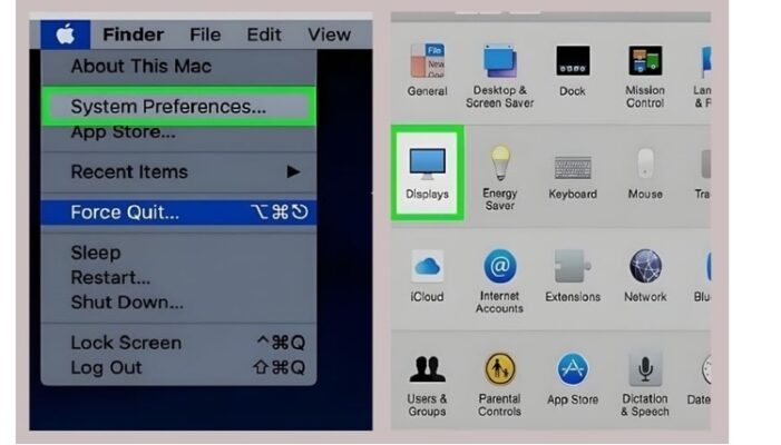 • Bước 1: Bạn thực hiện việc nhấp vào logo Apple ở góc phía trên bên trái. Bạn tiến hành việc chọn System Settings (Cài đặt hệ thống). Sau đó bạn tiến hành tìm và chọn mục Displays (Màn hình).