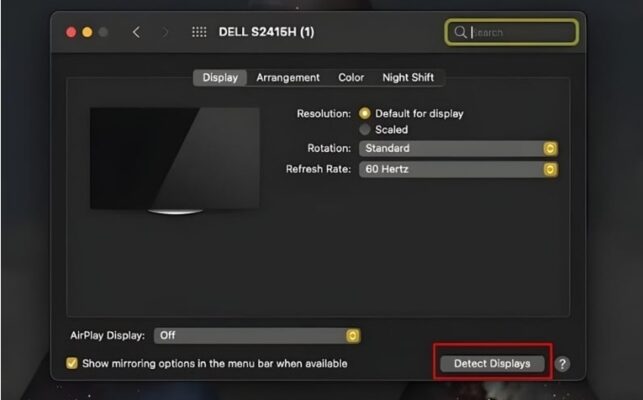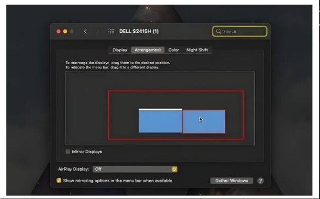 • Bước 3: Trường hợp bạn muốn mở rộng màn hình Mac chọn Arrangement. Rồi bạn thực hiện bỏ chọn ô Mirror Displays đi.