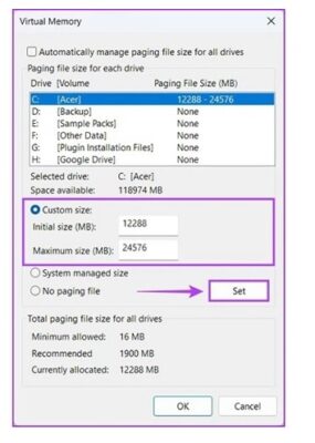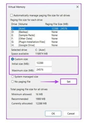 Lưu ý: Bạn nên tiến hành việc thiết lập kích thước ban đầu tương ứng với dung lượng Ram vật lý ở trên máy tính của bạn nhé. Đối với kích thước ở mức tối đa thì bạn có thể thiết lập gấp 1.5 hoặc là gấp 3 lần bộ nhớ Ram vật lý.