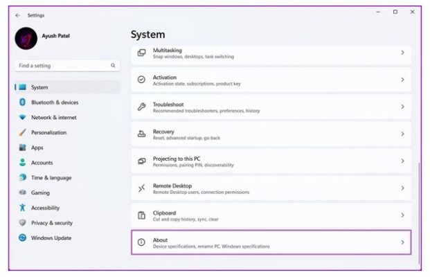 Sau đó, bạn hãy lần lượt bấm chọn vào System. Rồi bạn chọn tiếp mục About nằm ở phần khung bên trái.
