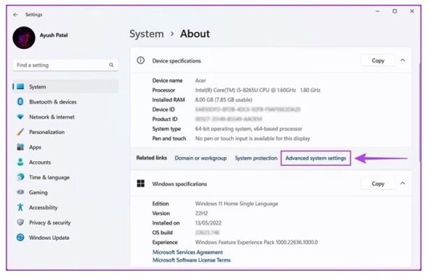 Ở tại mục About vừa hiển thị ra thì bạn tìm kiếm. Và bạn bấm chọn vào dòng chữ Advanced system settings.