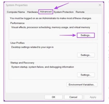 Ở ngay cửa sổ System Properties. Bạn tiến hành việc chọn vào thẻ Advanced. Bạn nhấn vào nút Settings ở tại phần Performance như hình ở bên dưới: