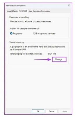 Sau khi bạn đã tiến hành được hoàn tất các thao tác như trên. Bạn đã tiến hành chuyển sang thẻ Advanced. Rồi tại đây, bạn tiến hành việc nhấn vào nút Change nằm bên dưới ở phần Virtual memory.