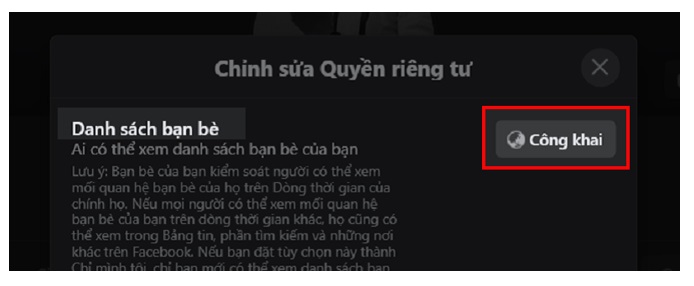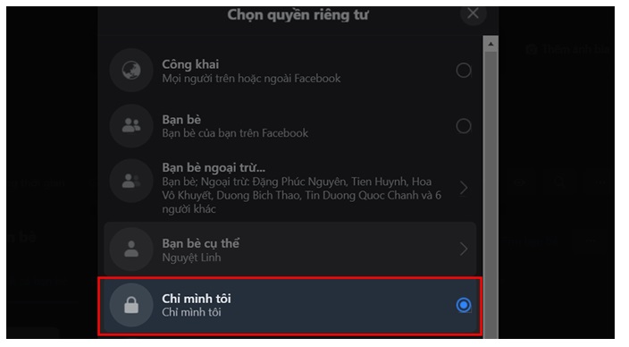 Một danh sách của những tùy chọn về quyền riêng tư sẽ được hiện ra (Công khai, Bạn bè và Chỉ mình tôi,…). Tương tự như ở trên máy tính thì để thực hiện ẩn được hoàn toàn danh sách bạn bè của bạn thì bạn hãy thực hiện chọn “Chỉ mình tôi” (Only Me).
