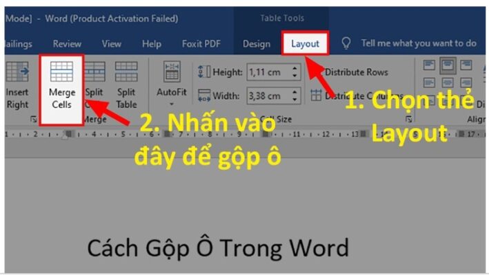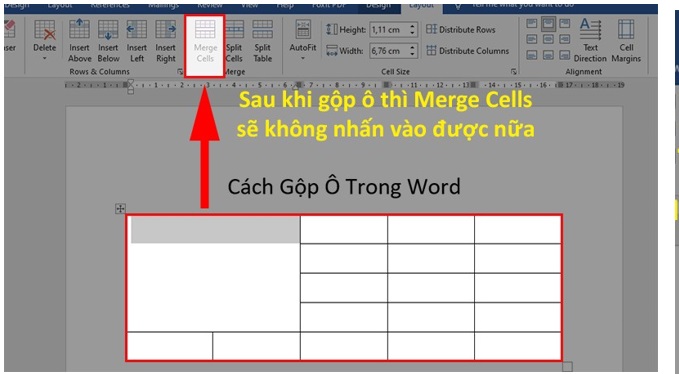 Bước 2: Bạn hãy chọn thẻ Layout. Rồi bạn chọn Merge Cells để gộp các ô vừa chọn.