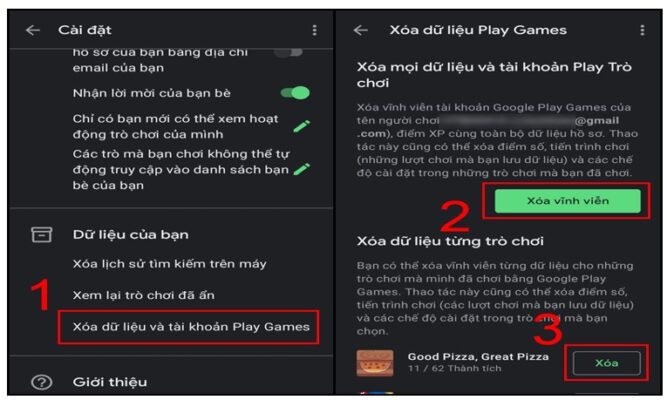 + Bước 2: Bạn hãy bấm vào chọn Xóa dữ liệu và tài khoản Play Games. Bạn nhấn vào chọn tiếp Xóa vĩnh viễn (2) để xóa được mọi dữ liệu và tài khoản ngay tại Play Game hay chọn tiếp Xóa (3) ở tại trò chơi mà bạn muốn thực hiện xóa đi dữ liệu game.
