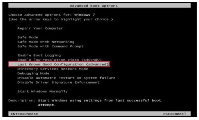 Bước 3: Tiếp theo thì bạn dùng những phím mũi tên lên xuống ở trên bàn phím. Để bấm chọn vào mục Last Known Good Configuration (advanced). Cuối cùng thì bạn chỉ cần bấm vào phím Enter ở trên bàn phím để máy tính được khởi động lại.