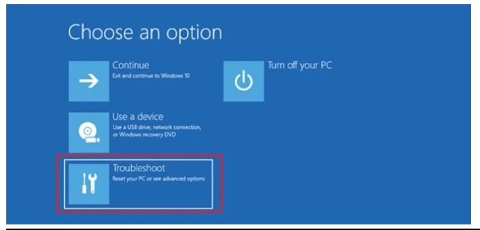 Bước 1: Bạn hãy bấm giữ đồng thời vào phím Shift với nút Restart. Ngay sau đó thì giao diện Choose an option sẽ được hiện ra trên màn hình máy tính. Bạn hãy lần lượt thực hiện nhấn chọn vào mục Troubleshoot. Bạn bấm chọn Advanced options để tiếp tục.
