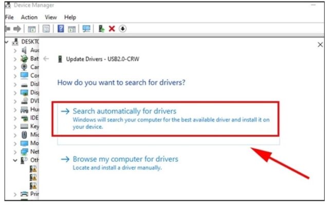 - Một là Update driver: Bấm chọn Search automatically for drivers để Windows tự động việc tìm kiếm. Và bạn tiến hành việc cài đặt phiên bản driver mới nhất.
